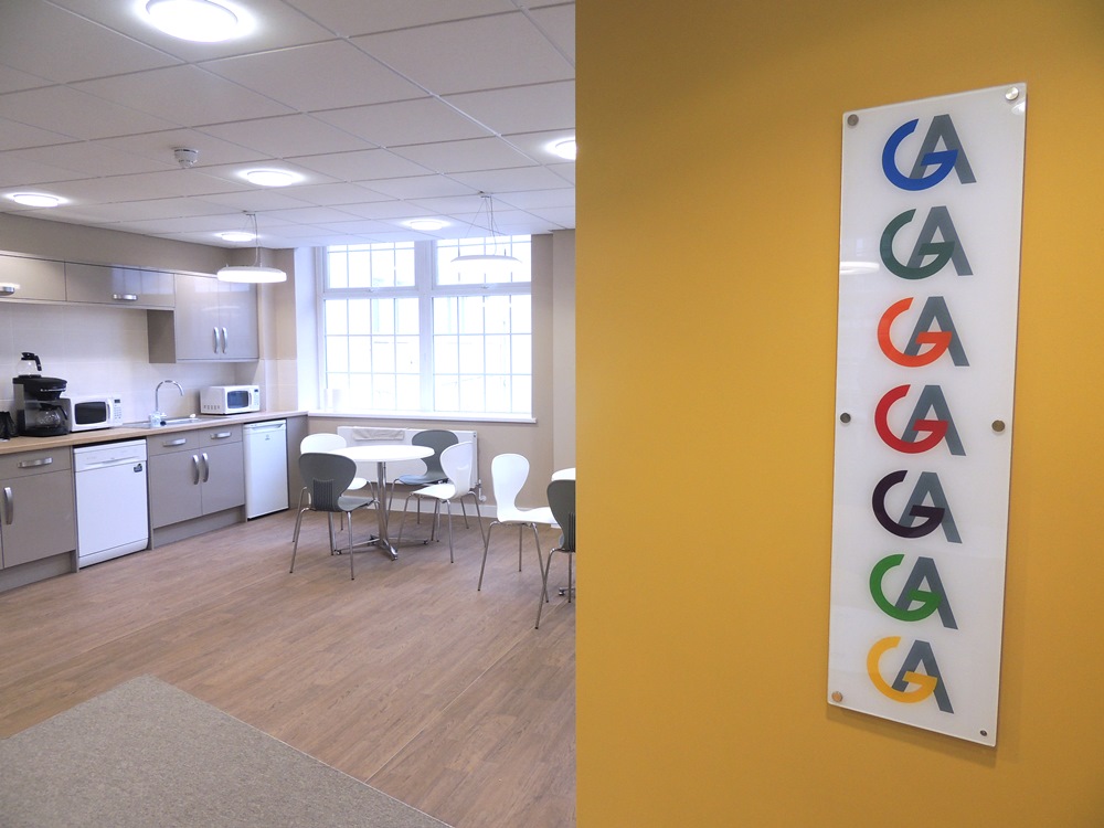 The final stage of this phased project required a completely new approach. Whilst the professional and corporate image extended to all working areas, Karris proposed an entirely different colour scheme for the staff breakout area. This gives a clear division between two important areas of normal working life. The only branding on display incorporates all of the GA departmental colours on acrylic panels. This area has already proved to be a success, and has attracted very complimentary comments from the staff.